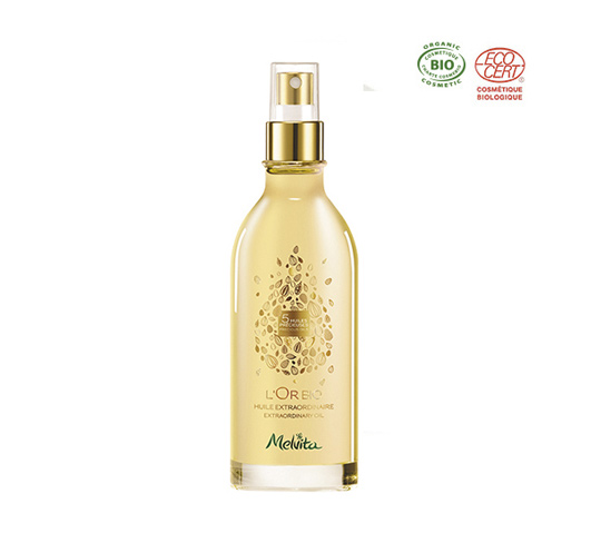 L'HUILE EXTRAORDINAIRE L'OR BIO DE MELVITAL'huile extraordinaire BIO de Melvita laisse les cheveux souples et brillants. Grâce à sa formule unique, l’huile extraordinaire bio apporte tous les bénéfices des omégas 3, 6 et 9 à la peau et aux cheveux en contribuant efficacement à leur nutrition et protection. Elle est enrichie en 5 huiles rares et précieuses, spécialement sélectionnées pour leurs bénéfices sur la peau et les cheveux. PETITE ASTUCE LES + DE L'OR BIO