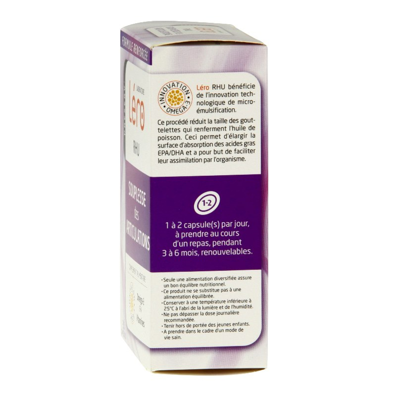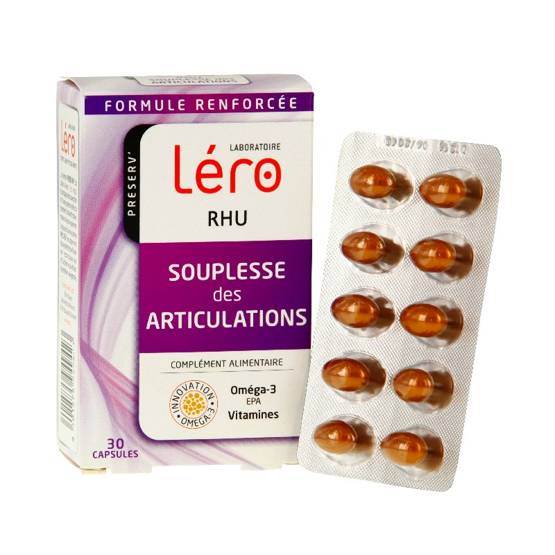 Les capsules RHU de Lero est une réponse originale pour la prise en charge de l'inconfort articulaire, en apportant des micronutriments qui aident à préserver une bonne mobilité et résistance articulaires. L'EPA et les oméga 3 d'origine marine s'intègrent dans les membranes des cellules et participe au confort articulaire. L'huile de poisson apportée par les capsules RHU de Lero est naturellement fortement concentrée en cet acide gras EPA (60%). Les vitamines B5 et B6 participent à de multiples réactions métaboliques nécessaires au maintien de l'intégrité des tissus du collagène. Le manganèse et le cuivre sont nécessaires à la fabrication du collagène présent dans le cartilage. Le zinc, le sélénium et la vitamine E agissent en synergie pour réduire les effets néfastes des radicaux libres qui altèrent notamment les cellules du cartilage. Une cure des capsules RHU de Lero vous aide à soutenir ou à entretenir naturellement et durablement le confort et la souplesse de vos articulations.