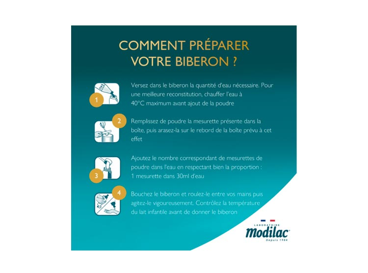 Nettoyez biberon, bouchon et tétine. Versez dans le biberon la quantité d’eau nécessaire. Employez une eau en bouteille peu minéralisée. Pour une meilleure reconstitution, l’eau peut être tiédie (40°C maximum) avant ajout de la poudre. Ajoutez le nombre correspondant de mesurettes rases de poudre dans l’eau en respectant bien la proportion. Bouchez le biberon et roulez-le entre vos mains puis agitez-le vigoureusement. Avant de donner le biberon, contrôlez la température du lait infantile.