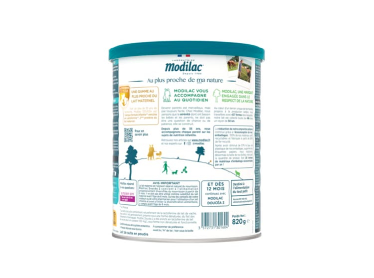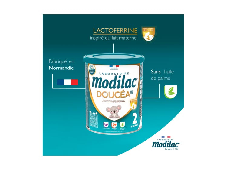 Modilac propose des formules infantiles toujours au plus proche du lait maternel. En complément d’une alimentation progressivement diversifiée, Modilac Doucéa 2 répond aux besoins nutritionnels spécifiques du nourrisson de 6 à 12 mois*. Sa formule contient de la Lactoferrine, la deuxième protéine du lait maternel, des vitamines A, C et D*, qui contribuent au fonctionnement normal du système immunitaire et également du DHA*, un acide gras essentiel de la famille des Oméga 3. Elle est sans huile de palme.
