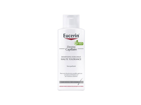 EUCERIN DermoCapillaire Shampoing Haute Tolérance a été développé spécialement pour ceux qui ont un cuir chevelu hypersensible. Sa formule très douce permet un lavage très délicat, tout en prévenant la sécheresse du cuir chevelu et en soulageant les sensations d'irritations, même si vous avez un cuir chevelu à problèmes ou hyper-réactif. Il soulage et apaise les sensations de démangeaisons dès la première utilisation.