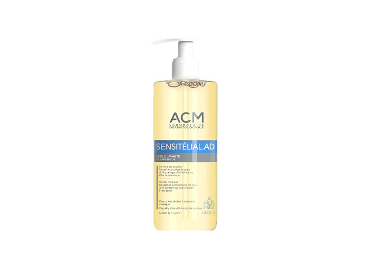 L’Huile lavante Sensitelial.AD de ACM nettoie en douceur, apaise les démangeaisons dès la 1re douche et protège durablement. Elle est le véritable allié des peaux très sèches à tendance atopique.
