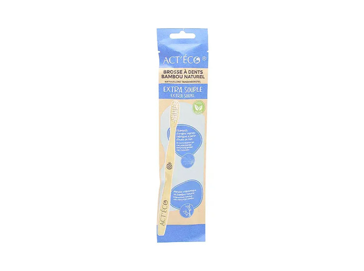 La brosse à dents en bambou extra souple de la marque Act'Eco est une brosse à dents composée d'un manche ergonomique en bambou naturel biodégradable et de filaments d'origine végétale fabriqués à partir d'huile de ricin. Elle permet un brossage efficace tout en respectant l'émail des dents et les gencives sensibles.