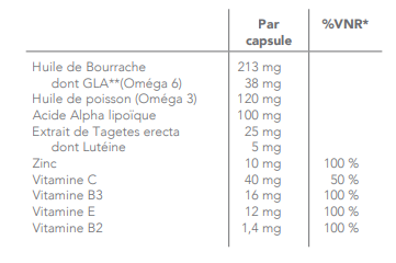 Huile de bourrache, tunique : gélatine de poisson à écailles, huile de poisson, acide alphalipoïque, humectant : glycérol, vitamine C (acide ascorbique), sulfate de zinc microencapsulé, lutéine extraite de Tagetes erecta, Vitamine E (d-alpha tocophérol), Vitamine B3 (Nicotinamide), épaississant : cire d’abeille jaune, Vitamine B2 (riboflavine), colorant : chlorophylle cuivrée