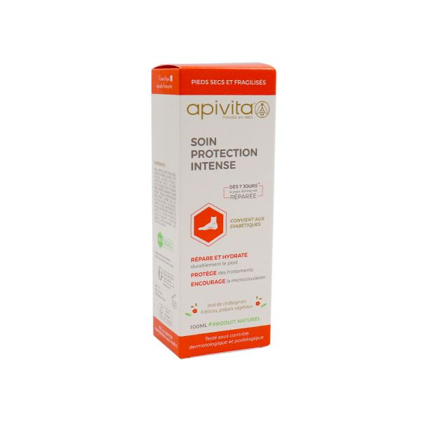 Le soin protection intense d'Apivita est une crème hydratante naturelle qui aide à combattre la sécheresse extrême que subissent les pieds très secs et fragilisés.La peau est hydratée en continu pendant 24h et protégée des frottements. Ce soin est testé sous contrôle dermatologique et podologique.