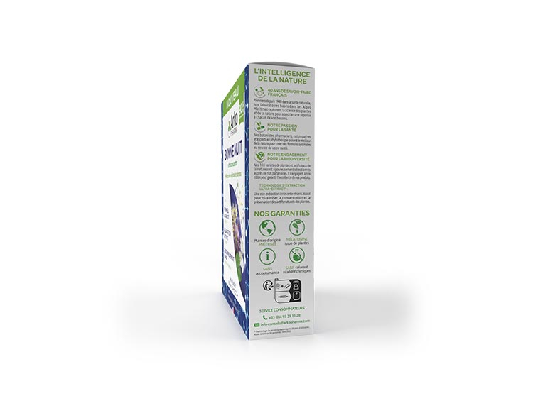 Extrait de plantes [obtenu à partir de 380 mg de feuille de mélisse (Melissa officinalis) et 190 mg de sommité fleurie d’aubépine (Crataegus monogyna, C. laevigata)] – Extrait de concentré de végétaux titré en mélatonine, obtenu à partir de 157 mg de concentré d’extrait végétaux [feuille de luzerne (Medicago sativa), graine de riz (Oryza sativa) et chlorella (Chlorella vulgaris) – Jus concentré de citron (Citrus limon) – Extrait de fleur de tilleul (Tilia Tomentosa).