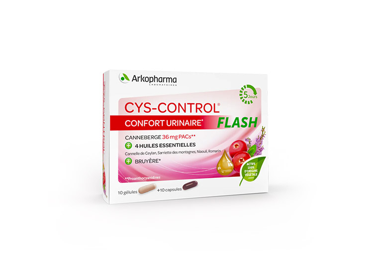 Besoin d’une aide pour un bon confort urinaire ? Cys-Control® Flash est un complément alimentaire à base de Bruyère, Canneberge et de 4 huiles essentielles (Niaouli, Cannelle de Ceylan, Romain, Sarriette des montagnes).
