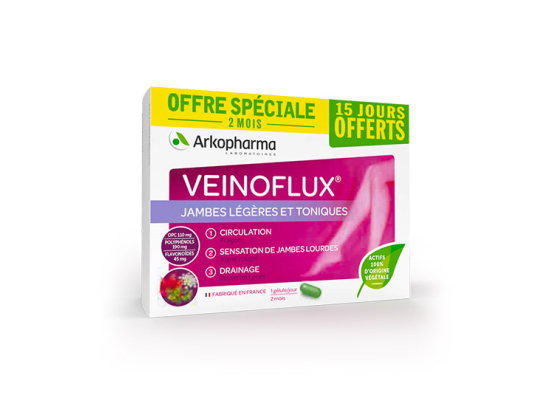 Veinoflux est un complément alimentaire à base de plantes et de vitamine B2. Il peut vous aider en cas de sensation de jambes gonflées, pesanteur, fatigue dans les jambes et/ou jambes lourdes. Il est également conseillé en cas de forte chaleur ou si votre emploi nécessite de rester debout sur une période prolongée.