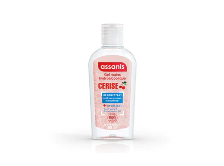 Le gel hydroalcoolique 80ml cerise Assanis désinfecte vos mains sans eau ni savon en 30 secondes à n'importe quel moment de la journée. Ce gel hydroalcoolique parfumé à la cerise laissera un doux parfum gourmand sur vos mains après chaque utilisation! Efficace sur les coronavirus et fabriqué en France. La formule de notre gel hydroalcoolique Assanis se veut :