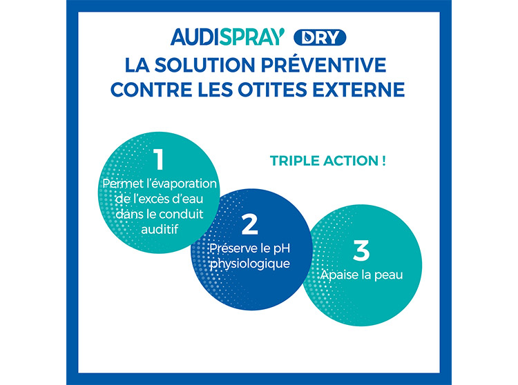 Audispray Dry crée les conditions favorables afin de prévenir les effets néfastes d’une humidité excessive dans l’oreille, tels que la prolifération bactérienne, qui peut entraîner une otite externe (également appelée otite du baigneur). Grâce à la combinaison des ingrédients présents dans sa formule, Audispray Dry a une triple action dans le conduit auditif externe :