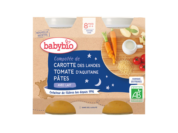 Faites découvrir à bébé une recette pleine d’imagination. Carottes des Landes, purée de tomates d'Aquitaine et pommes de terre du Val de Loire s’accompagnent de pâtes françaises. Du basilic et du romarin viennent sublimer ce savoureux mélange qui laissera les petits gourmands rêveurs.