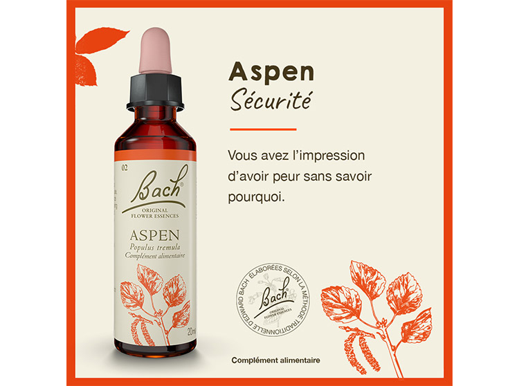 Fleurs de Bach Original, Fleur de Bach compte-gouttes, Fleur de bach pour le bien-être émotionnel, Elixir floral, Fleur de Bach émotions, Fleur de Bach soucis, Fleur de Bach Aspen, Fleur de Bach sécurité, Fleur de Bach pour rassurer, complément alimentaire naturel, complément alimentaire sécurité, complément alimentaire confiance, complément alimentaire à base de plantes, complément alimentaire compte-gouttes, complément alimentaire buvable.