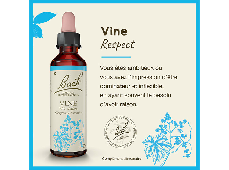 Fleurs de Bach Original, Fleur de Bach compte-gouttes, Fleur de bach pour le bien-être émotionnel, Elixir floral, Fleur de Bach émotions, Fleur de Bach respect, Fleur de Bach Vine, Fleur de Bach vigne, Fleur de Bach préoccupation excessive, complément alimentaire naturel, complément alimentaire remise en question, complément alimentaire respect, complément alimentaire caractère autoritaire, complément alimentaire équilibre émotionnel, complément alimentaire à base de plantes, complément alimentaire en gouttes buvable.