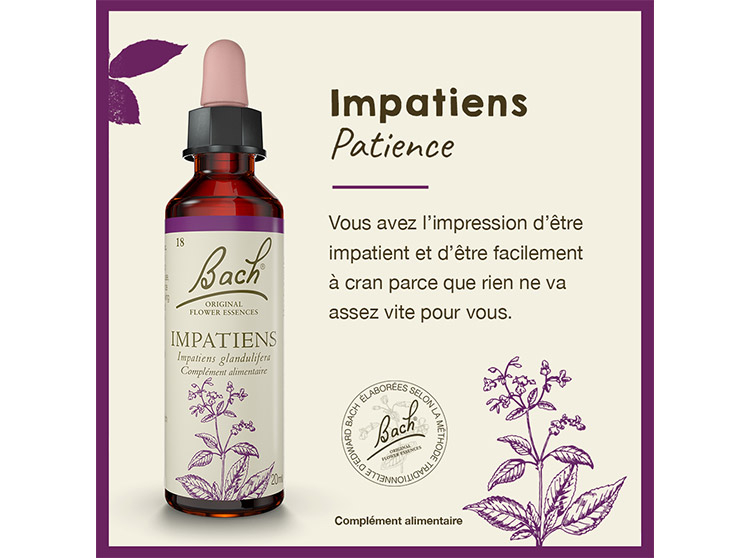 Fleurs de Bach Original, Fleur de Bach compte-gouttes, Fleur de bach pour le bien-être émotionnel, Elixir floral, Fleur de Bach émotions, Fleur de Bach patience, Fleur de Bach Impatiens, Fleur de Bach Balsamine de l’Himalaya, Fleur de Bach solitude, complément alimentaire naturel, complément alimentaire patience, complément alimentaire impatience, complément alimentaire solitude, complément alimentaire équilibre émotionnel, complément alimentaire à base de plantes, complément alimentaire en gouttes buvable.