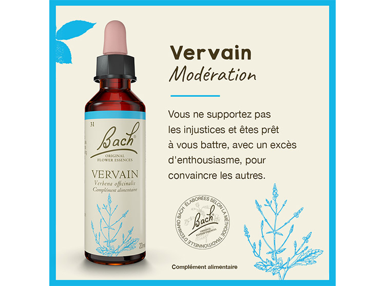 Fleurs de Bach Original, Fleur de Bach compte-gouttes, Fleur de bach pour le bien-être émotionnel, Elixir floral, Fleur de Bach émotions, Fleur de Bach modération, Fleur de Bach Vervain, Fleur de Bach verveine, Fleur de Bach préoccupation excessive, complément alimentaire naturel, complément alimentaire énergie débordante, complément alimentaire modération, complément alimentaire préoccupation excessive, complément alimentaire équilibre émotionnel, complément alimentaire à base de plantes, complément alimentaire en gouttes buvable.