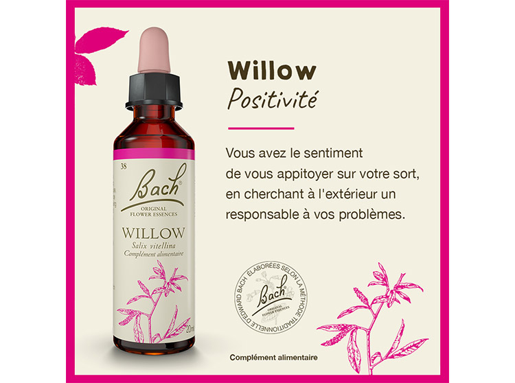 Fleurs de Bach Original, Fleur de Bach compte-gouttes, Fleur de bach pour le bien-être émotionnel, Elixir floral, Fleur de Bach émotions, Fleur de Bach positivité, Fleur de Bach Willow, Fleur de Bach saule blanc, Fleur de Bach état plaintif, complément alimentaire naturel, complément alimentaire humeur positive, complément alimentaire positivité, complément alimentaire émotions, complément alimentaire sensibilité, complément alimentaire à base de plantes, complément alimentaire en gouttes buvable.