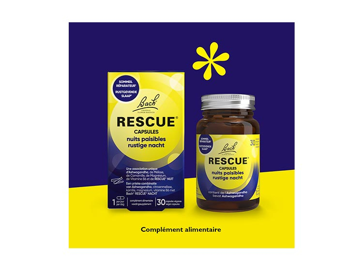 Les Capsules RESCUE® Nuit Paisible aident à se détendre avant le coucher et se préparer à une bonne nuit de sommeil.