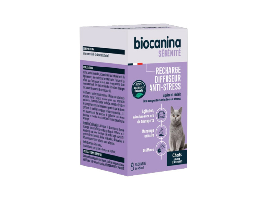 Il est recommandé de brancher le diffuseur anti-stress biocanina en continu dans la pièce où le chat passe le plus de temps.