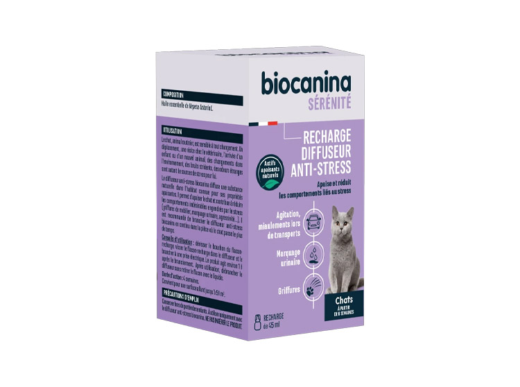 Le diffuseur anti-stress biocanina diffuse une substance naturelle dans l’habitat connue pour ses propriétés apaisantes chez le chat. Il permet d’apaiser le chat et contribue à réduire les comportements indésirables engendrés par le stress (griffures de mobilier, marquage urinaire, agressivité, agitation, miaulements lors de transports …).