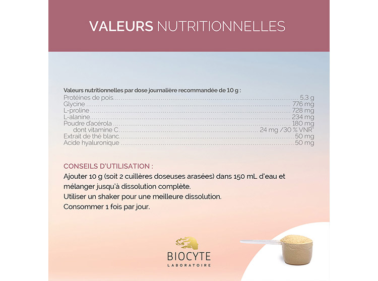 Verser 150 ml d’eau sur 2 cuillères doseuses arasées (soit 10 g) de Collagen Boost Vegan Biocyte et mélanger jusqu’à dissolution complète. Utiliser un shaker pour une meilleure dissolution. Consommer 1 fois par jour.