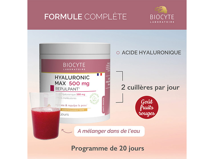 Biocyte innove et crée le complément alimentaire Hyaluronic Max. Le complément alimentaire Biocyte Hyaluronic Max contient une formule ultra concentrée en acide hyaluronique. Hyaluronic Max Anti-âge est une délicieuse préparation hautement concentrée en acide hyaluronique pour hydrater et raffermir la peau.
