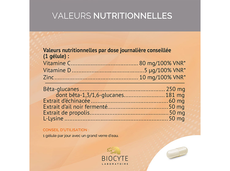 Bêta-glucanes de levure M-Gard® Saccharomyces cerevisiae (dont bêta-1,3 / 1,6-glucanes) ; Enveloppe de la capsule d'origine végétale (agent d'enrobage: hydroxypropylméthylcellulose); Acide L-ascorbique (dont vitamine C); Chlorhydrate de L-lysine; Extrait de parties aériennes d'Echinacea purpurea (L.) Moench (maltodextrine); Extrait de bulbe d'ail noir fermenté Allium sativum L. (maltodextrine); Extrait de propolis (maltodextrine); Bisglycinate de zinc; Anti-agglomérant: sels de magnésium d'acides gras; Cholécalciférol (dont vitamine D3).