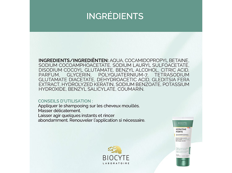 Les ingrédients clés du Shampoing kératine Forte biocyte :