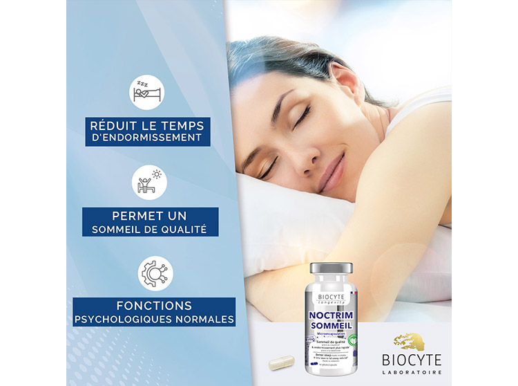 Noctrim Sommeil est un complément alimentaire issu de l'expertise en nutraceutique du Laboratoire Biocyte. Il est destiné aux personnes stressées et/ou qui ont du mal à s’endormir. Noctrim Sommeil est un complément alimentaire à base de mélatonine, inositol, magnésium microencapsulé, extrait de coquelicot et vitamine B6. La mélatonine aide à réduire le temps d’endormissement et le coquelicot aide à un meilleur sommeil.