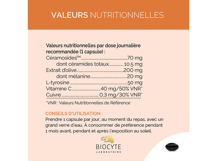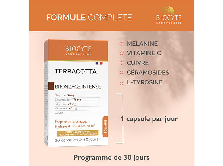 Biocyte Terracotta Bronzage Intense est le premier complément alimentaire à base de mélanine issue d’olives noires associée à des CéramosidesTM. Deux actifs innovants et des molécules spécifiques de l’épiderme permettant de préparer la peau à l’exposition solaire, sublimer le bronzage et préserver le capital jeunesse de la peau.