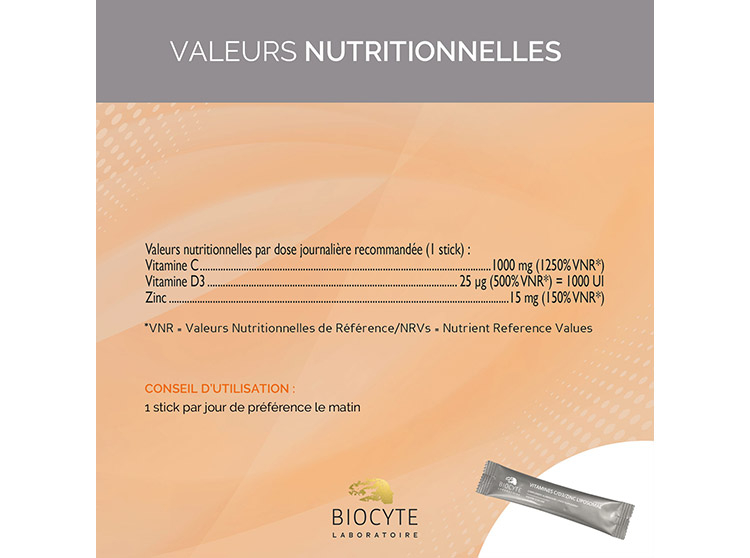 Vitamine D - Vitamine D3 - Vitamine C - Zinc - Biocyte - Biocyte vitamine D3, C et Zinc - Biocyte Vit C/D3/Zinc - Complément alimentaire à la vitamine C - Complément alimentaire à la vitamine D3 - Complément alimentaire au Zinc - Vitamine C, vitamine D3 et Zinc - Synergie - Booster les défenses immunitaires - Complément alimentaire en Stick - Stick - Stick de vitamine D3 - Vitamine C en stick - Zinc en stick - Complément alimentaire de vitamine D3, C et de zinc en stick - Végétariens - Végétaliens