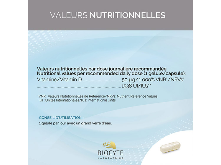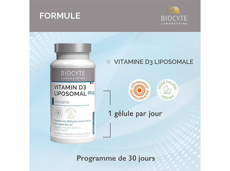 Prendre 1 gélule par jour de vitamine D3 liposomal Biocyte Longevity.