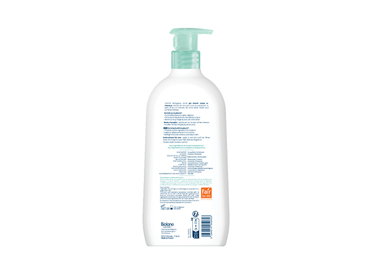 Certifié biologique, ce Gel Lavant Corps et Cheveux au parfum doux et délicat, est garanti haute tolérance.