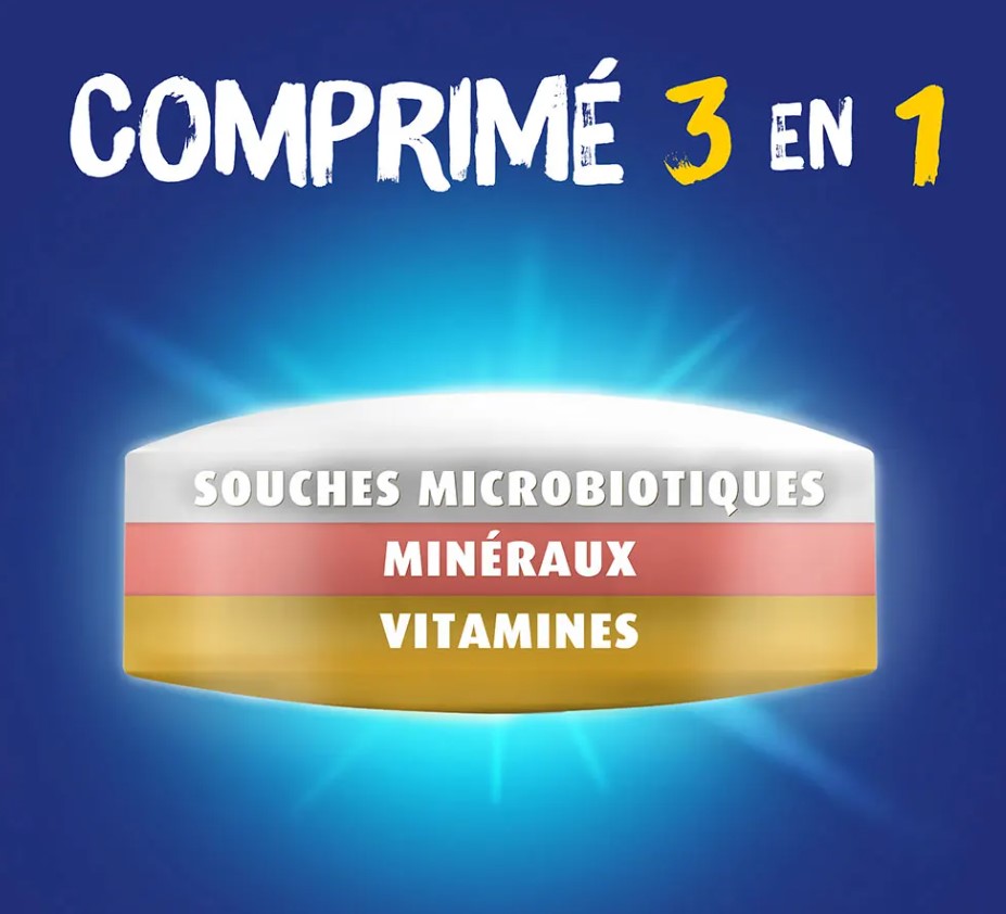 12 vitamines : A, B1, B2, B3, B5, B6, B8, B9, B12, C, D, E et 7 minéraux : iode, fer, zinc, sélénium, chrome, manganèse, magnésium. La vitamine D et le zinc contribuent au fonctionnement normal du système immunitaire et le fer aide à réduire la fatigue.