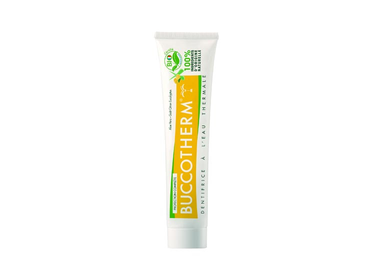 Buccotherm Protection complète au citron et à l'eucalyptus est un dentifrice BIO composé à 100% d’ingrédients d’origine naturelle. Sa formule unique associe l’Eau thermale de Castéra-Verduzan à l’Aloe Vera pour renforcer les dents et protéger les gencives. Formulé avec du fluor – 1450 ppm – il aide à combattre efficacement les attaques acides et à prévenir la formation des caries. Son arôme naturel de citron eucalyptus procure une agréable sensation de fraîcheur.