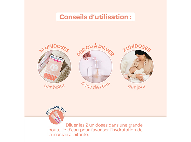 Le complément alimentaire Calmosine Allaitement est à boire pur ou dilué dans un grand volume d’eau.