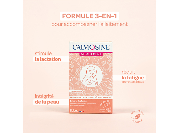 Le complément alimentaire pour femmes allaitantes Calmosine Allaitement a été développé avec le soutien de sage-femmes pour aider les mamans à avoir du lait en quantité suffisante, mais aussi à récupérer de la fatigue et à ne pas craquer nerveusement.
