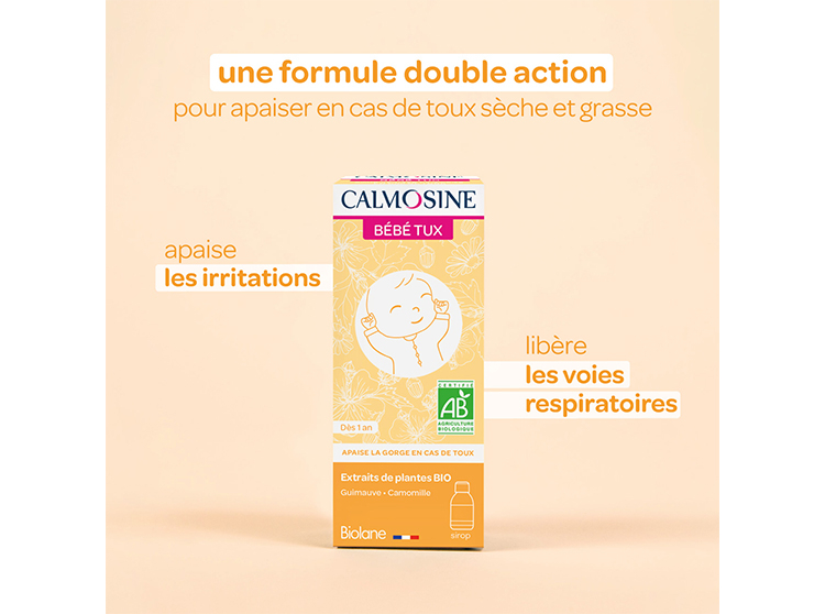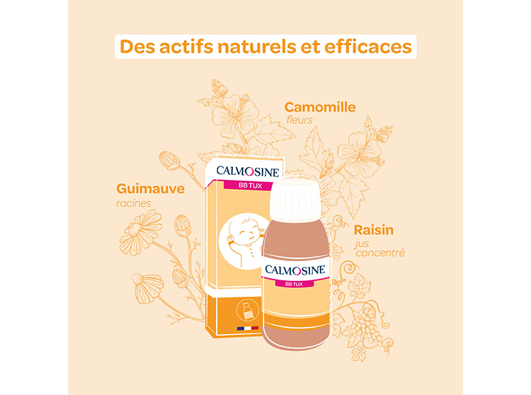 Calmosine Bébé TUX est un complément alimentaire qui contribue à apaiser les irritations de la gorge en cas de toux et à libérer les voies respiratoires grâce à la camomille. Son jus naturel de raisin BIO apporte un goût agréable au sirop.