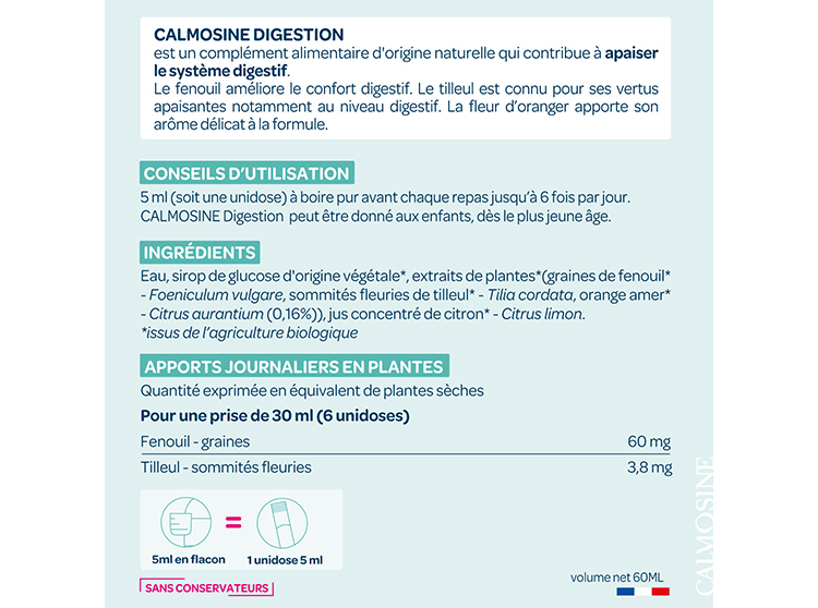 Une dose de Calmosine digestion de 5 ml à boire pure avant chaque repas jusqu’à 6 fois par jour.