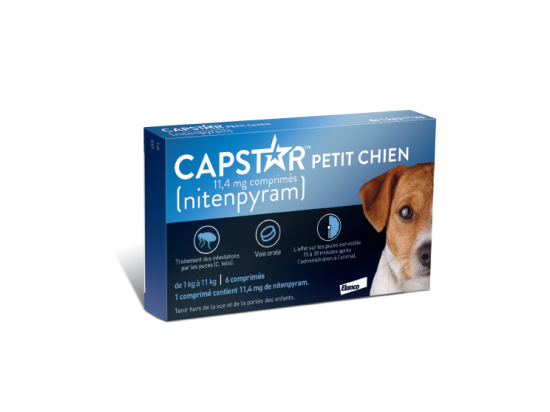 Le comprimé Capstar pour petit chien est un traitement interne des infestations par les puces (C. felis) dosé à 11,4mg de nitenpyram par comprimé. Les comprimés Capstar pour petits chiens agissent en quelques minutes pour se débarasser des puces. Au bout de 6h, 95 à 100% des puces seront tuées.