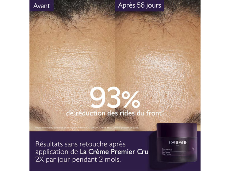 (*Test in vitro sur La Crème Premier Cru après 17 applications sur 58 jours. **Étude clinique, 43 volontaires, 56 jours. ***Étude clinique, % de satisfaction, 43 volontaires, 56 jours.)
