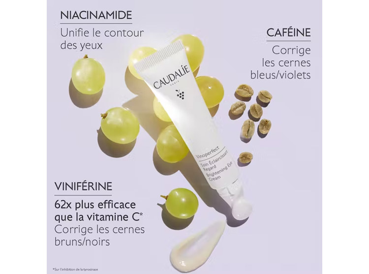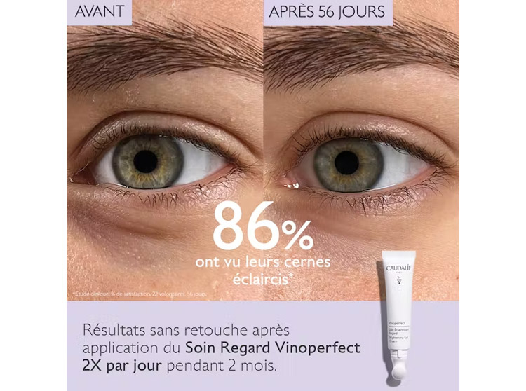 Le Soin Éclaircissant Regard Vinoperfect corrige tous les types de cernes, qu'ils soient vasculaires (cernes bleus ou violets) ou pigmentaires (cernes bruns ou noirs). En un seul geste, il hydrate et illumine le contour des yeux grâce à son embout rafraîchissant en céramique, pour un regard visiblement reposé.