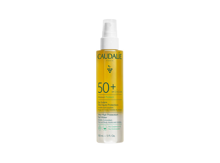 L'Eau Solaire Très Haute Protection SPF50+ Caudalie Vinosun protect protège efficacement visage, corps et cheveux des UVA/UVB tout en offrant une action anti-oxydante aux peaux les plus sensibles. Sa texture invisible mi-eau mi-huile pénètre rapidement sans effet gras et laisse un doux parfum d'été sur la peau. Une formule clean et respectueuse de l'océan pour toute la famille !