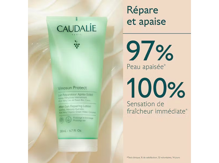 Le Lait Réparateur Après-Soleil Caudalie est enrichi en extrait d'aloe vera, eau de raisin bio et huile de noix de coco pour intensément hydrater et apaiser la peau après exposition au soleil. La sensation de fraîcheur est immédiate pour une peau souple, saine et un bronzage prolongé d'au moins 2 semaines.