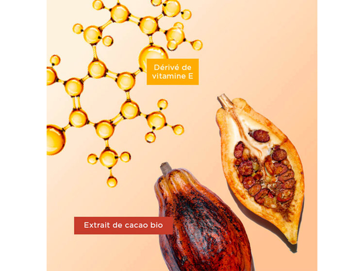 Le plus Clarins : Sa formule innovante combine extrait de cacao bio et dérivé de vitamine E, renforçant la protection de la peau tout en nourrissant et préservant sa jeunesse.