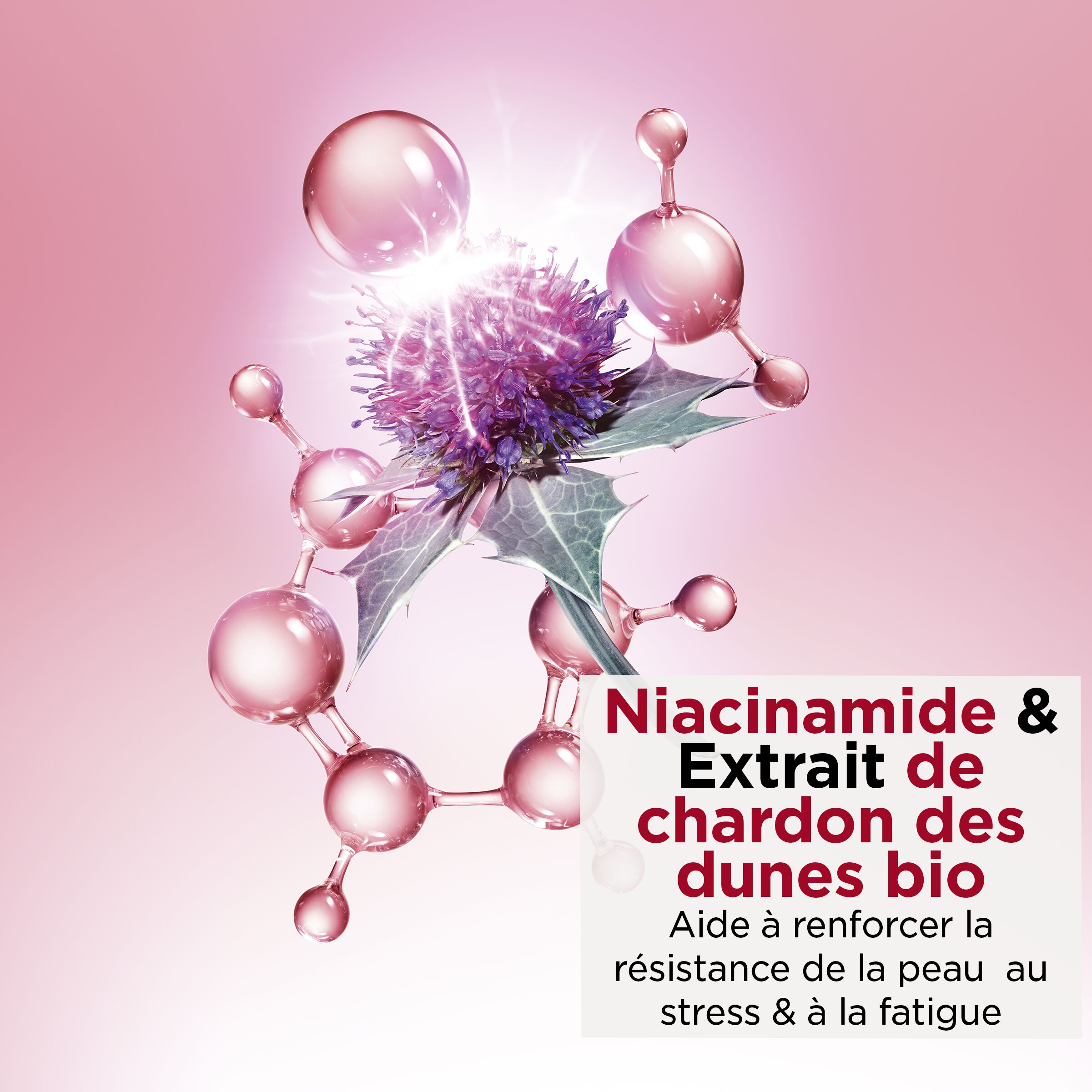 Innovation technologique Clarins : le Skin Charger Complex. Un duo d'actifs puissants : le Niacinamide associé à l’extrait de Chardon des Dunes bio participe à lisser la peau et à renforcer sa résistance.*