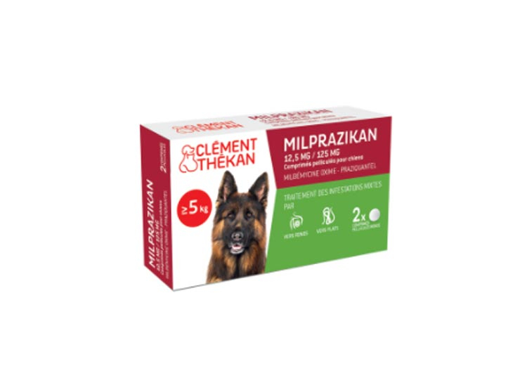 Le vermifuge Milprazikan 12,5mg/125mg est sous forme de deux comprimés pelliculés sécables adaptés pour les chiens de minimum 5 kilos. Ce vermifuge pour chiens traite les diverses infections de vers, à savoir les vers ronds (cestodes) et les vers plats (nématodes).