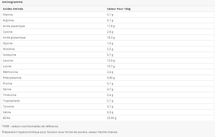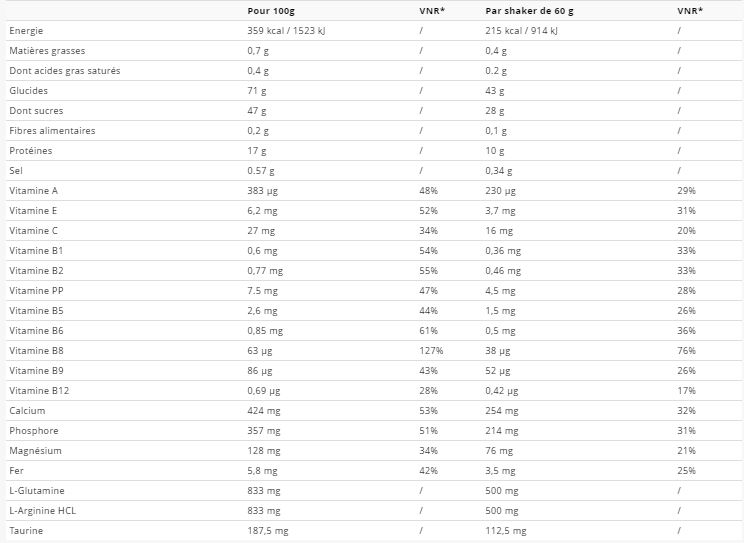 Complexe glucidique 54.5% (fructose, maltodextrines, dextrose, amidon de maïs, farine d’avoine (gluten), patate douce en poudre), lait écrémé en poudre, protéines de lactosérum 5% (lait) (émulsifiant : lécithine de tournesol, phosphate tricalcique), arômes, poudre de blanc d’œuf, L-glutamine, L-arginine HCL, taurine, minéraux : oxyde de magnésium - pyrophosphate de fer, vitamines : C-E-PP-A-B5-B6-B2-B1-B9-B8.