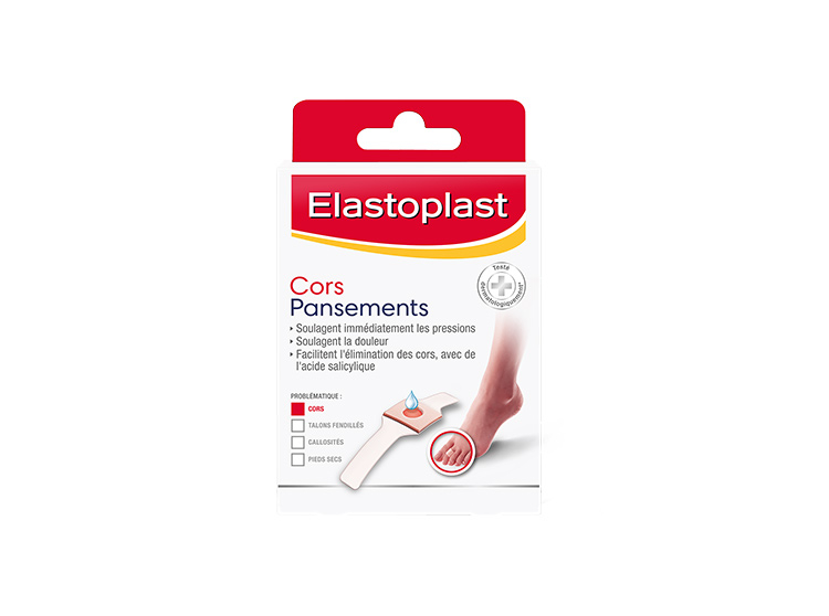 Elastoplast Pansements Cors soulagent immédiatement la douleur provoquée par la pression et les frottements et aident à éliminer les cors. Ils possèdent un anneau de mousse qui apaise instantanément la douleur et la pression sur la zone concernée. L'acide salicylique se trouvant au centre de l'anneau ramollit la corne. Au bout de 4 jours, le cor peut être éliminé dans un bain chaud d'eau savonneuse ou salée.