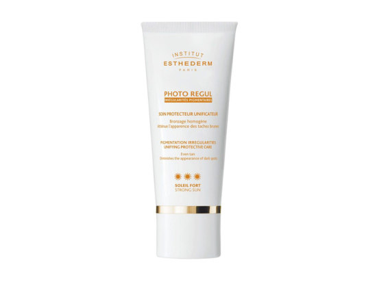 Esthederm Photo Regul Soin Protecteur Unificateur Soleil Fort 50 ml est un soin sous forme de crème qui permet d'atténuer les taches pigmentaires en réduisant le contraste entre les zones hyper-pigmentées et la peau bronzée, et garantit ainsi un bronzage uniforme et harmonieux.Ce soin minimise le risque d'hyper-pigmentation et favorise un bronzage uniforme. Il prévient le photo-vieillissement et les taches brunes car il protège l'ADN et prévient les dommages cellulaires grâce à la technologie brevetée Global Cellular Protection. Il prévient l'apparition des rides en luttant contre les facteurs de dégradation du collagène.