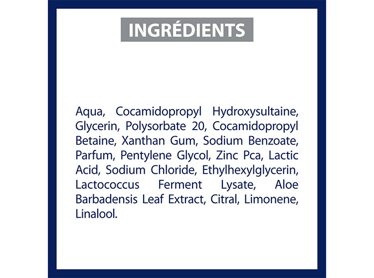 Aqua, Cocamidopropyl Hydroxysultaine, Glycerin, Polysorbate 20, Cocamidopropyl Betaine, Xanthan Gum, Sodium Benzoate, Parfum, Pentylene Glycol, Zinc Pca, Lactic Acid, Sodium Chloride, Ethylhexylglycerin, Lactococcus Ferment Lysate, Aloe Barbadensis Leaf Extract, Citral, Limonene, Linalool.